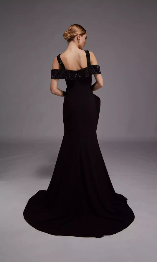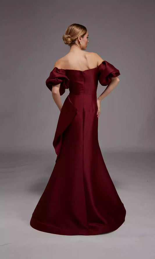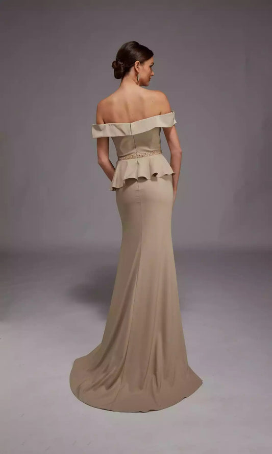 Elegant off shoulder formal straight neck slim fit cut with natural pleats at the waist and floor hem Prom Dresses