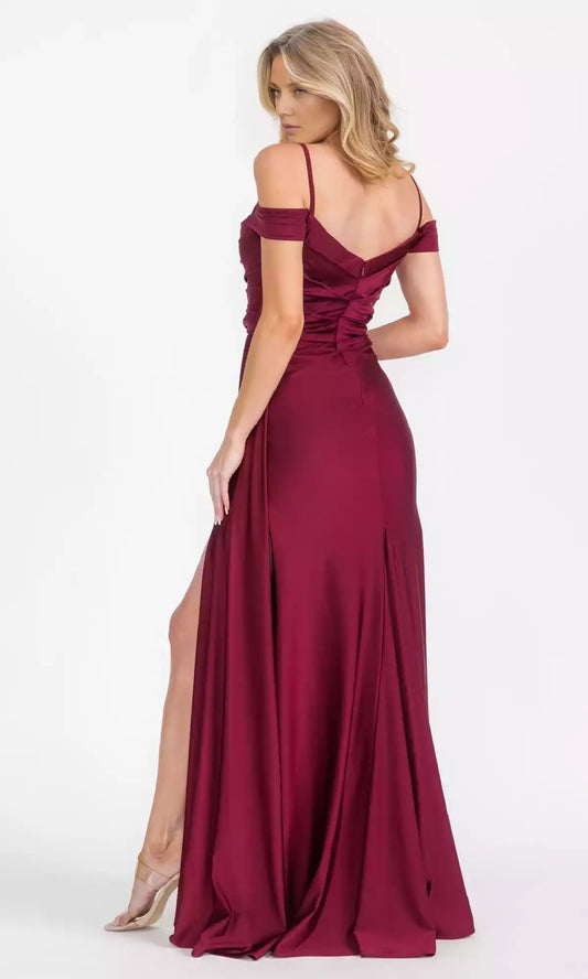 Elegant off shoulder long hanging neckline with slim shoulder straps, A-line skirt, and a side slit that runs to the ground. Prom Dresses
