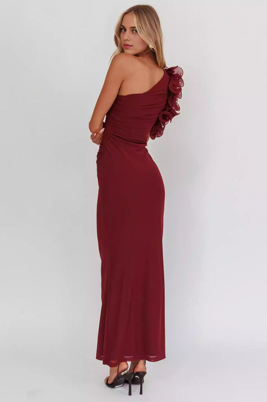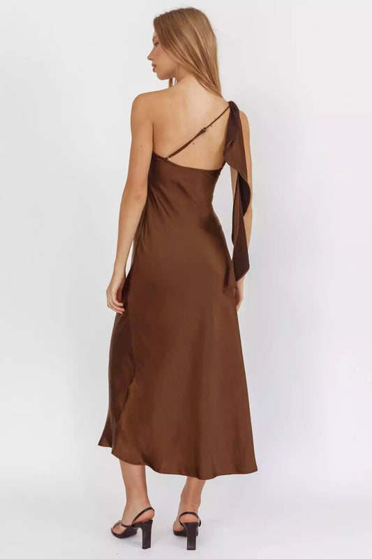 Gorgeous satin extra long single shoulder strap with ruffled edges, unlined, invisible side zipper Prom Dresses