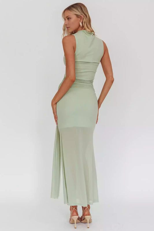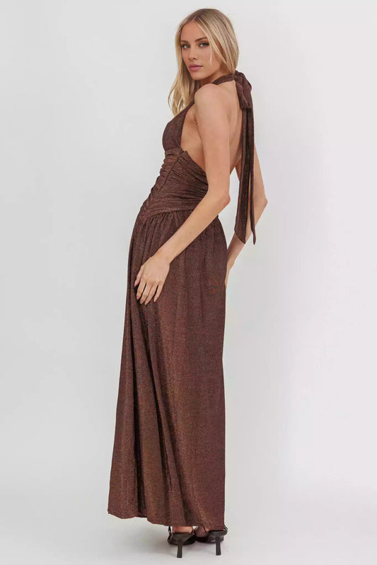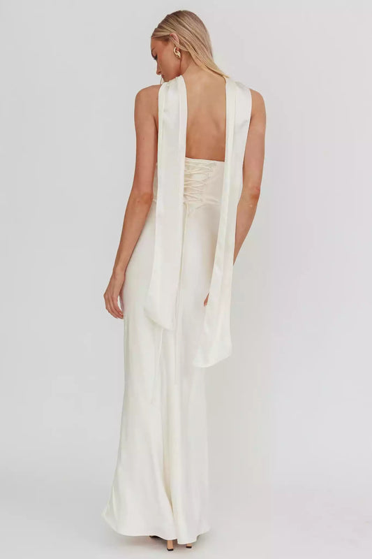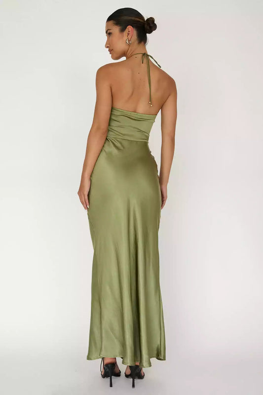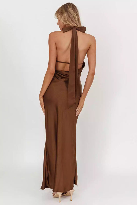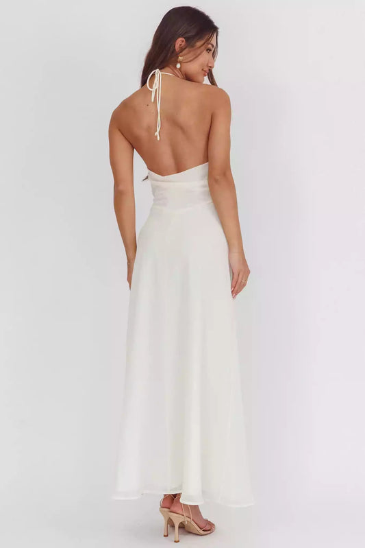 Absolutely stunning hanging neck collar, exposed back, side zipper, front leg slit Prom Dresses