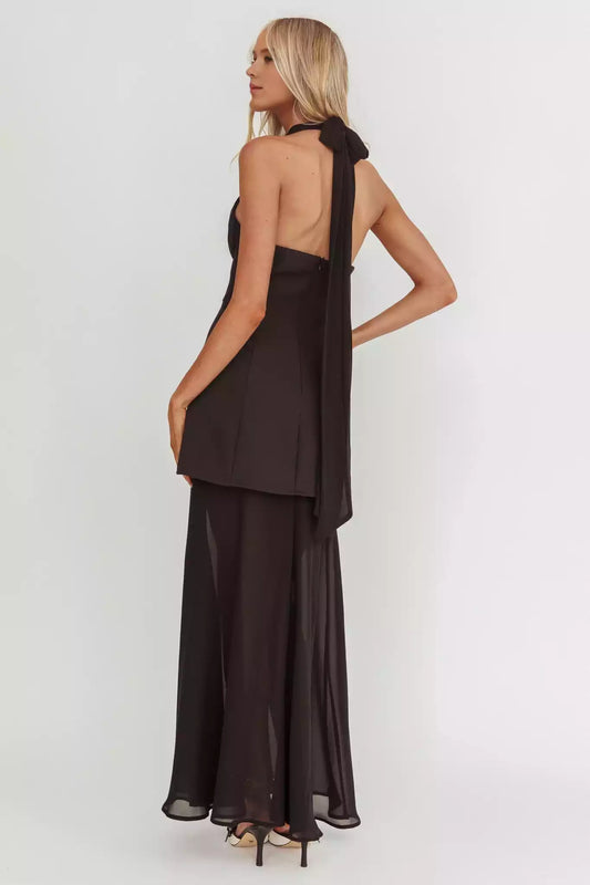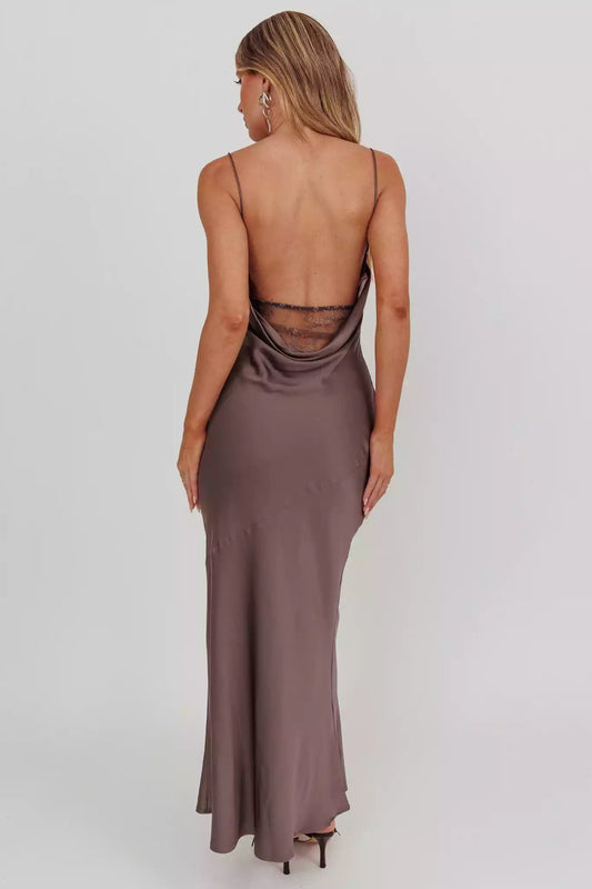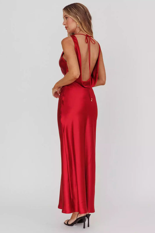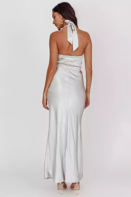 Gorgeous satin ultra long scarf style backless collar with hollowed out hanging texture invisible side zipper Prom Dresses