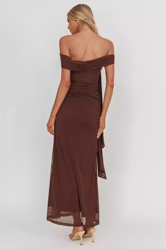 Stunning mid length unlined off shoulder crepe fabric with zipper back Prom Dresses