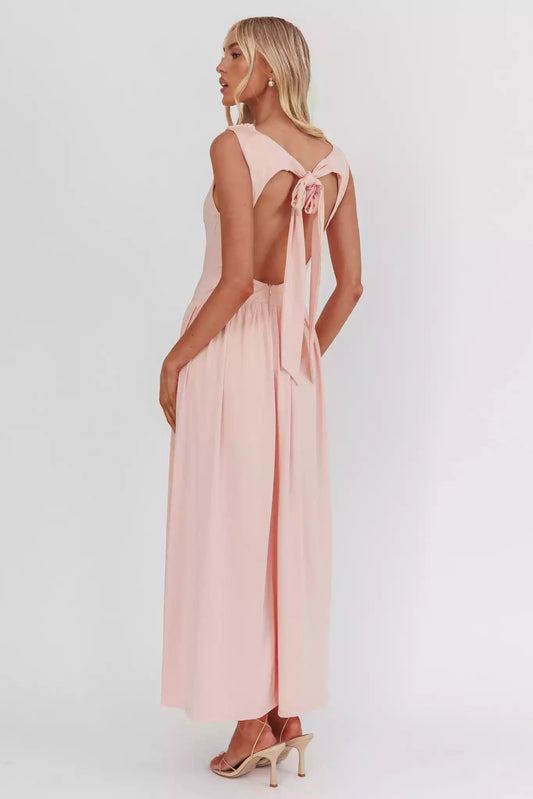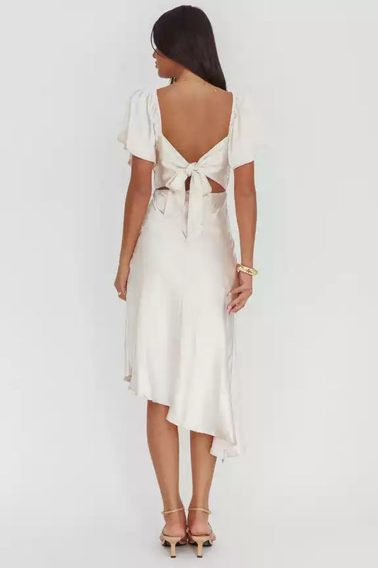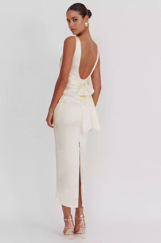 Fashionable satin mid length backless detail with slit and half lining bow details Prom Dresses