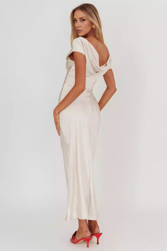 Stunning satin mid length boat collar without lining, hidden side zipper Prom Dresses