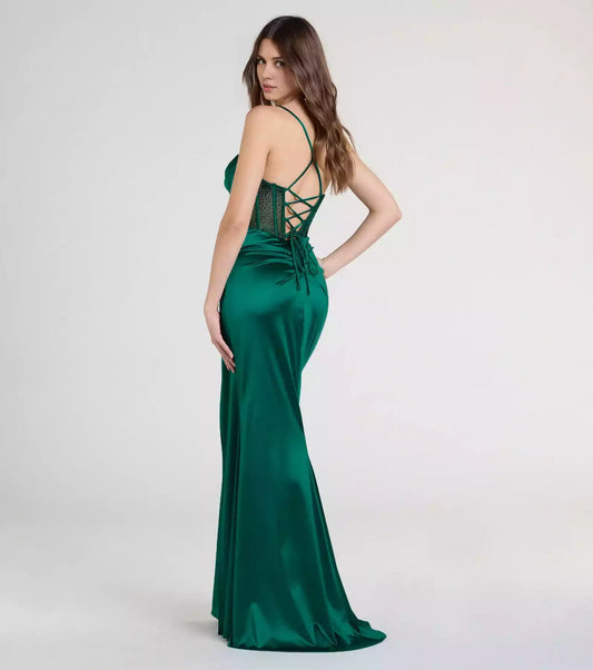 Stunning satin lace up backless neckline, snug fit, high slit and floor Prom Dresses