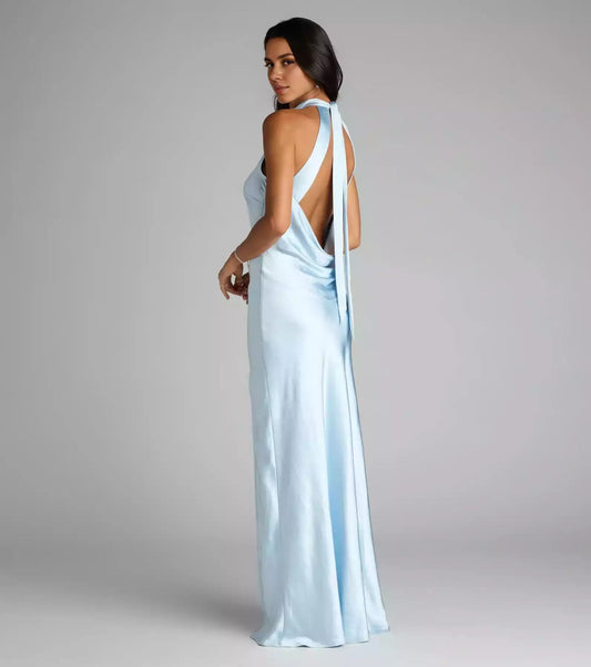 Elegant high-quality satin woven sleeveless backless deep V-pillar silhouette and floor skirt Prom Dresses