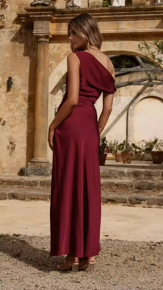 Exquisite one shoulder neckline, wide shoulder straps, pleated side seams, fishtail skirt, asymmetrical high slit Prom Dresses