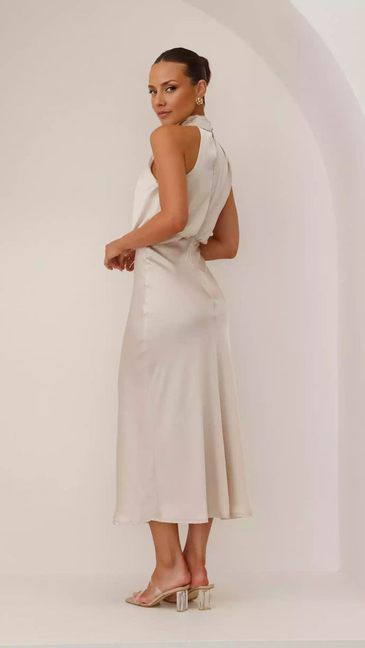 Stunning neck hanging high neck satin sexy side slit hanging collar hidden side zipper Prom Dresses