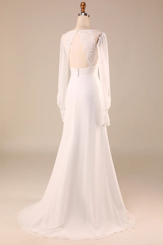 Ivory Long Sleeves Boho Chiffon Open Back Wedding Dress