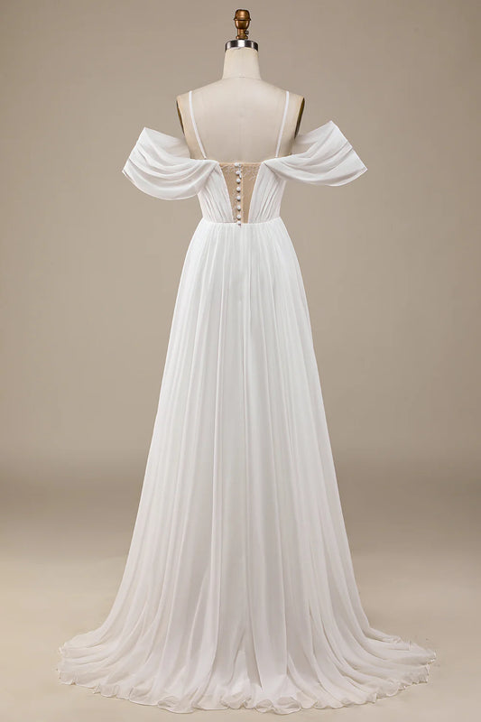 Ivory Chiffon Sweep Train Boho Wedding Dress