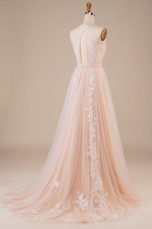 Tulle Halter Keyhole Champagne Wedding Dress