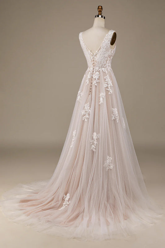 A-Line V-Neck Pleated Tulle Wedding Dress With Long Sleeves