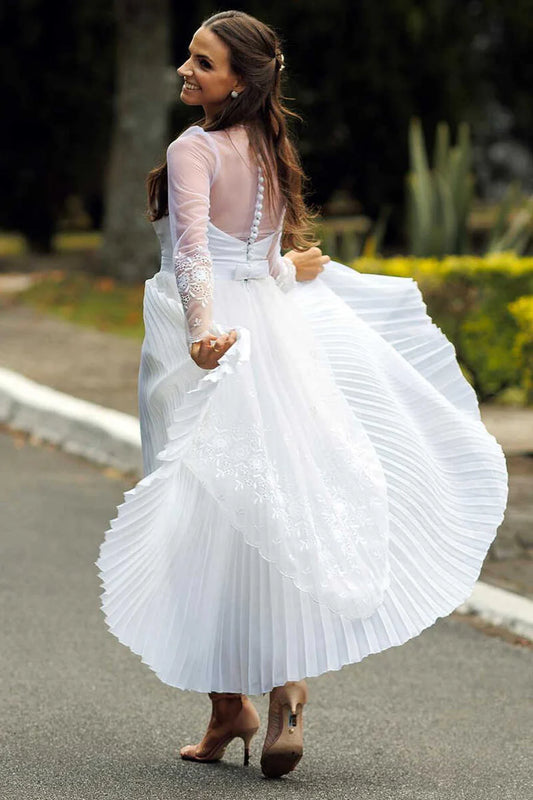 Sweetheart Sheer Sleeve Tea-length Wedding Dress