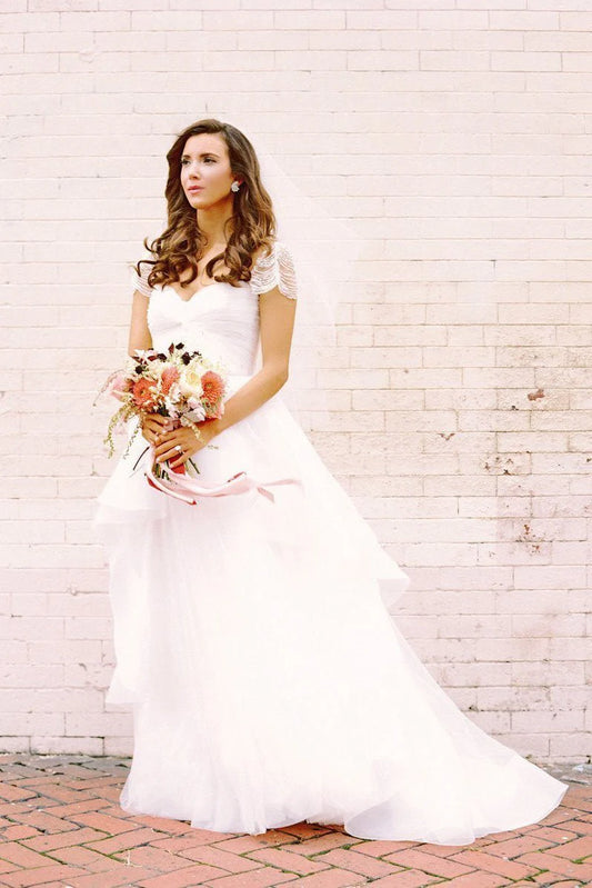 A-line Sweetheart Short sleeved Elegant Tulle Embroidered Wedding Dress