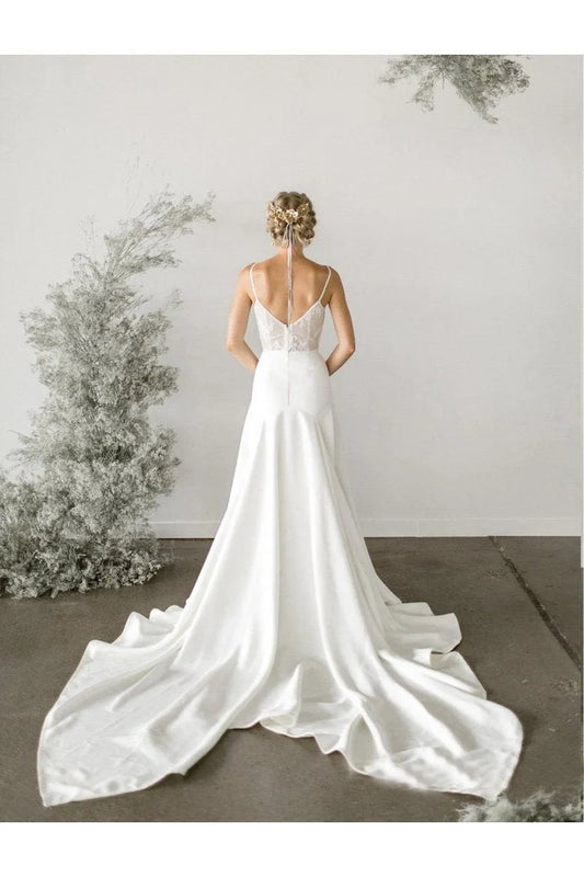 Minimalist deep V-neck satin slit backless white wedding dress elegant bride dress