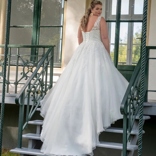 Large size long elegant and noble A-line V-neck sleeveless lace decal wedding dress