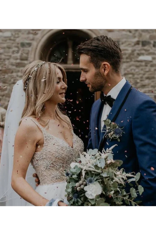 Diamond shoulder strap with full pearl embellishment neckline wedding dress paired with sequin sheer wedding dress