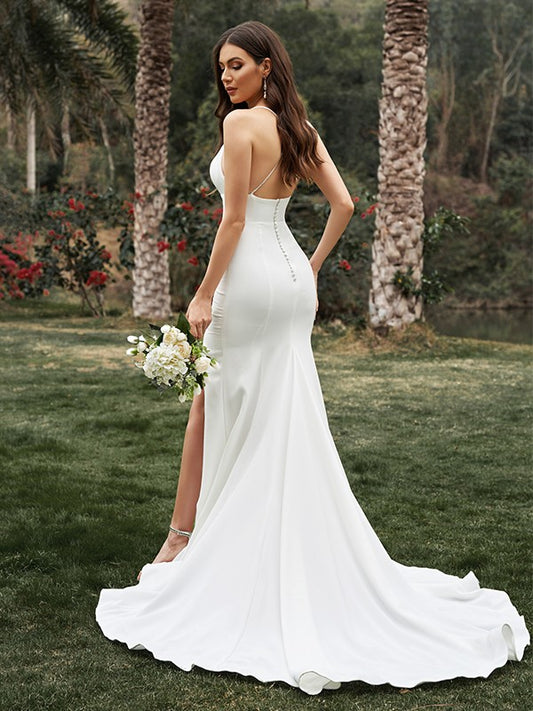 Elastic Crepe Silk Lace V-Neck Sleeveless Large Swing Fragmented Flower Tail Wedding Dress