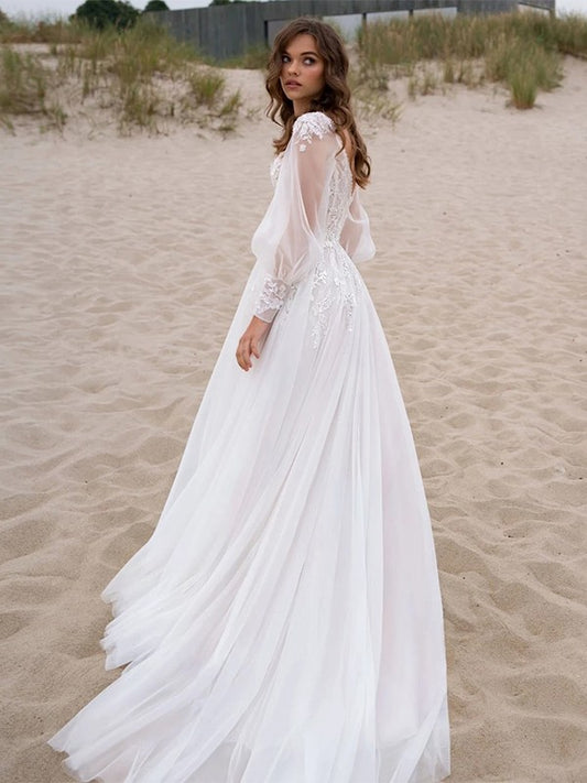 A-line Elegant Princess Tulle Sticker Hollow Long sleeved Church Style Train Wedding Dress