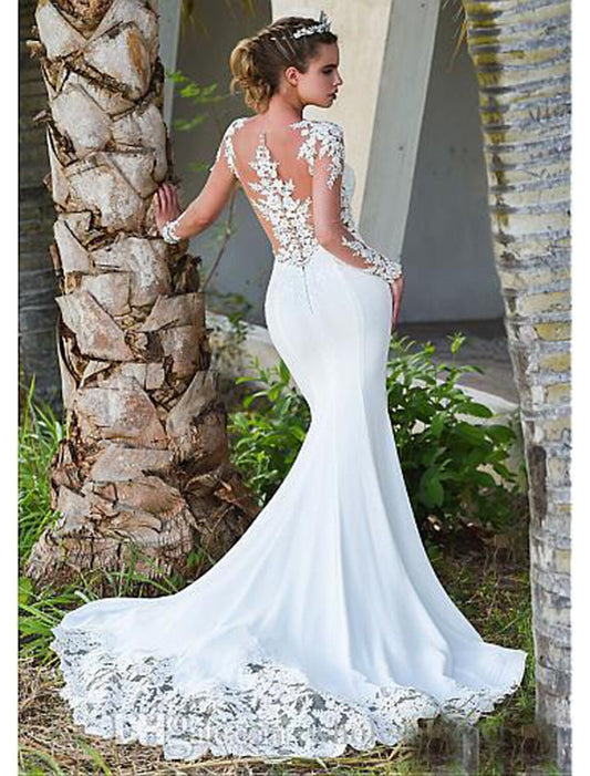 Engagement Backless Formal Wedding Dress Fishtail Horn Phantom Neck Long sleeved Lace Bridal Dress with Stickers