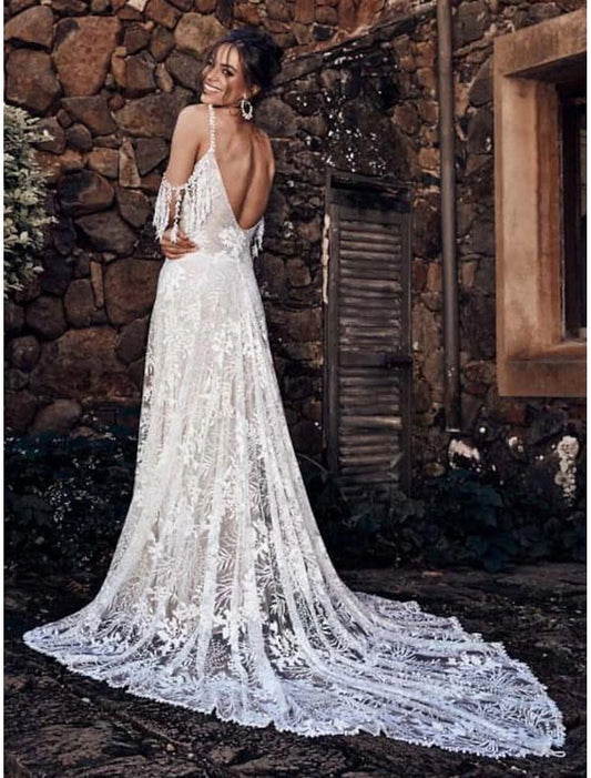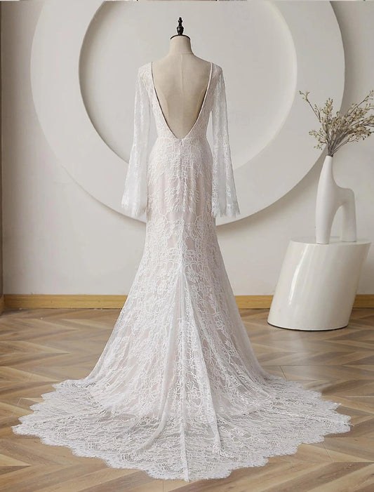 Beach Backless Bohemian Wedding Dress Mermaid V-neck Long sleeved Brush Tail Lace Bridal Dress with Flowers