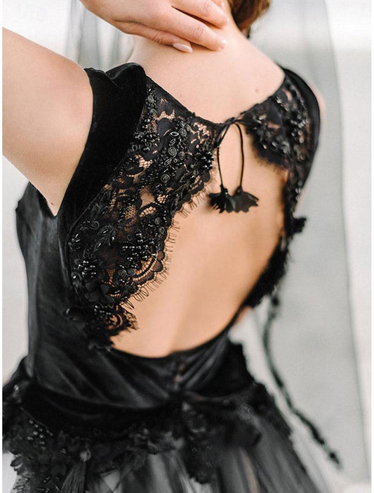 Beach Wedding Bohemian Black Wedding Dress A-shaped V-neck Sleeveless Palace Trail Lace Front Split Bridal Dress