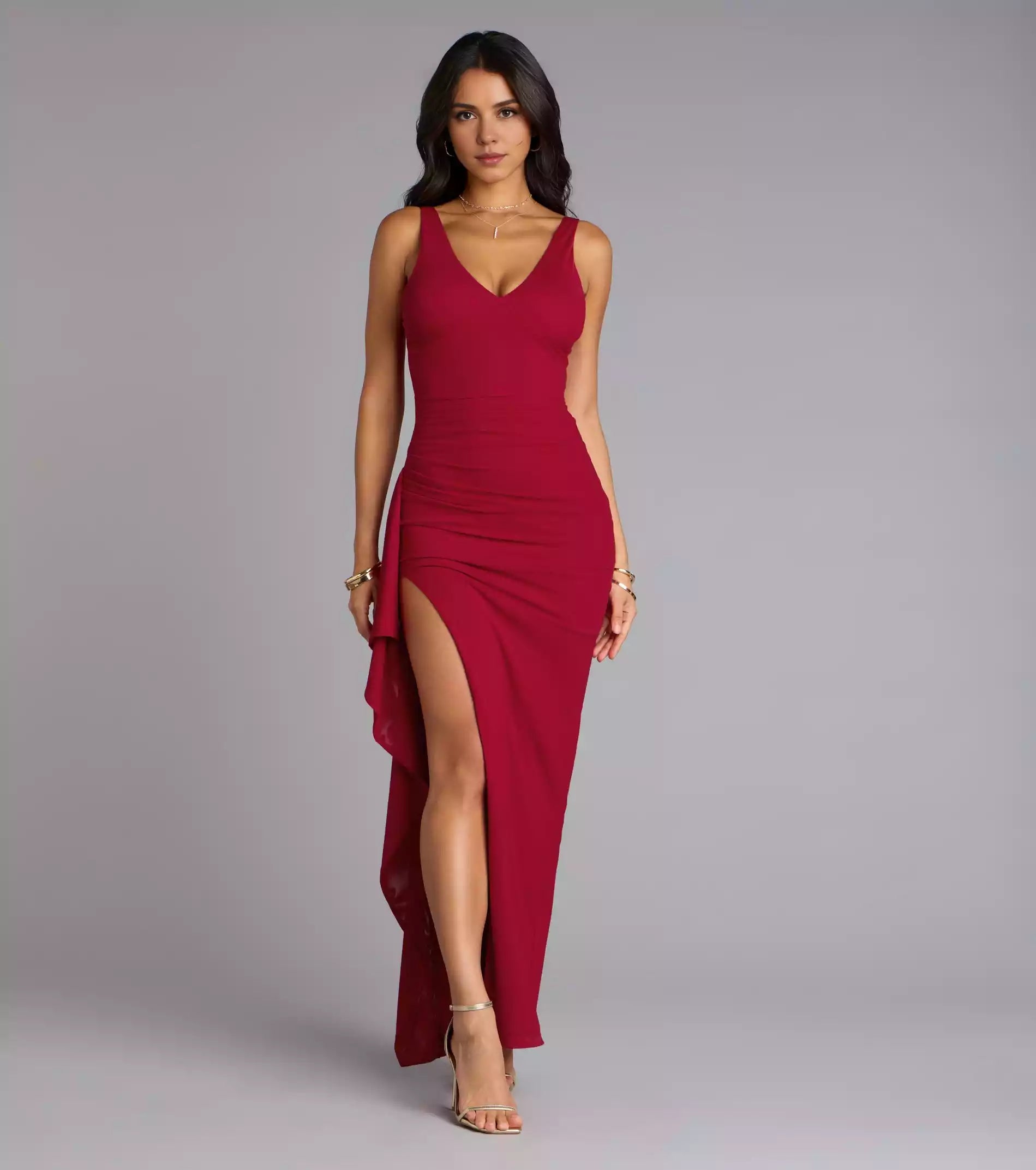 Charming lightweight mesh sleeveless V-neck, slim shoulder straps, pleated high slit, ruffled edges on the sides Prom Dresses