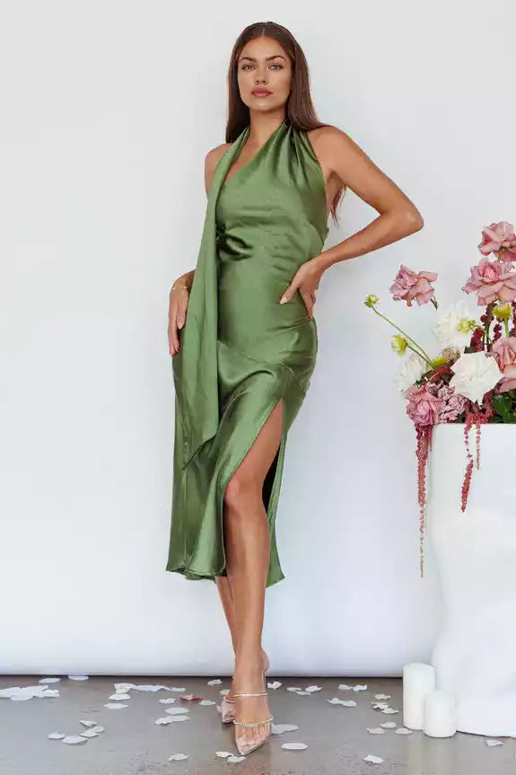 OKBBN's charming mid length bust is lined with a front slit neckline and lace up straps, while the side features zippers for Bridesmaid Dresses. This long dress is elegant and sexy. The neck hanging design exposes the charming shoulders and neck, showcasing unique charm. The backless element adds a touch of sexiness and fashion, and the split skirt hem looks more elegant while walking. The smooth fabric fits the body shape, highlighting the beauty of curves, allowing you to easily become the focus of attention at dinners, parties, and other occasions, releasing the unique charm of elegance and sexiness.