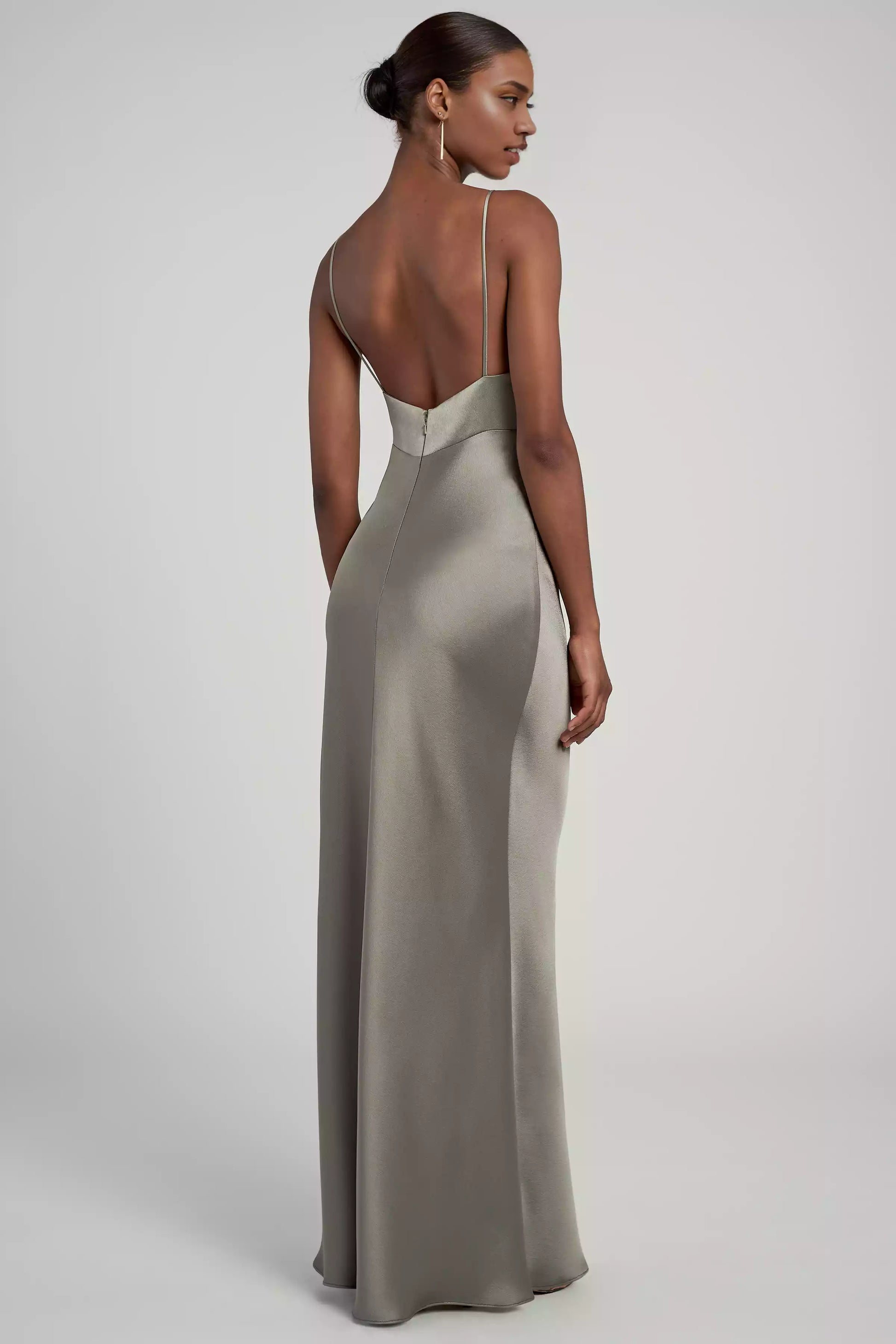 OKBBN's classic camisole satin V-neck thin shoulder strap, low round neck diagonal cut skirt, and mid zip Bridesmaid Dresses. This evening gown is made of satin material, with a deep V-design and backless elements, showcasing sexiness and elegance. The long silhouette fits the body shape, and the satin fabric has a premium texture, suitable for occasions such as socialite banquets and formal dinners. It is a high-quality choice to showcase noble temperament and fashionable taste.