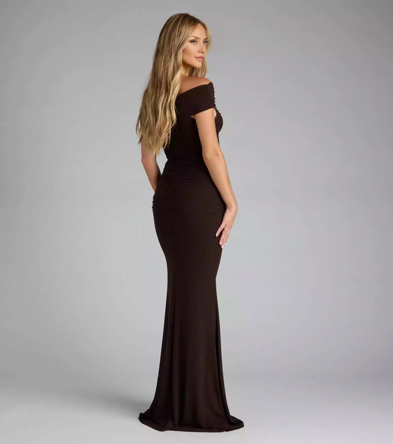 Confident and elegant off shoulder neckline with side stitching, pleated mermaid silhouette, and floor skirt Prom Dresses