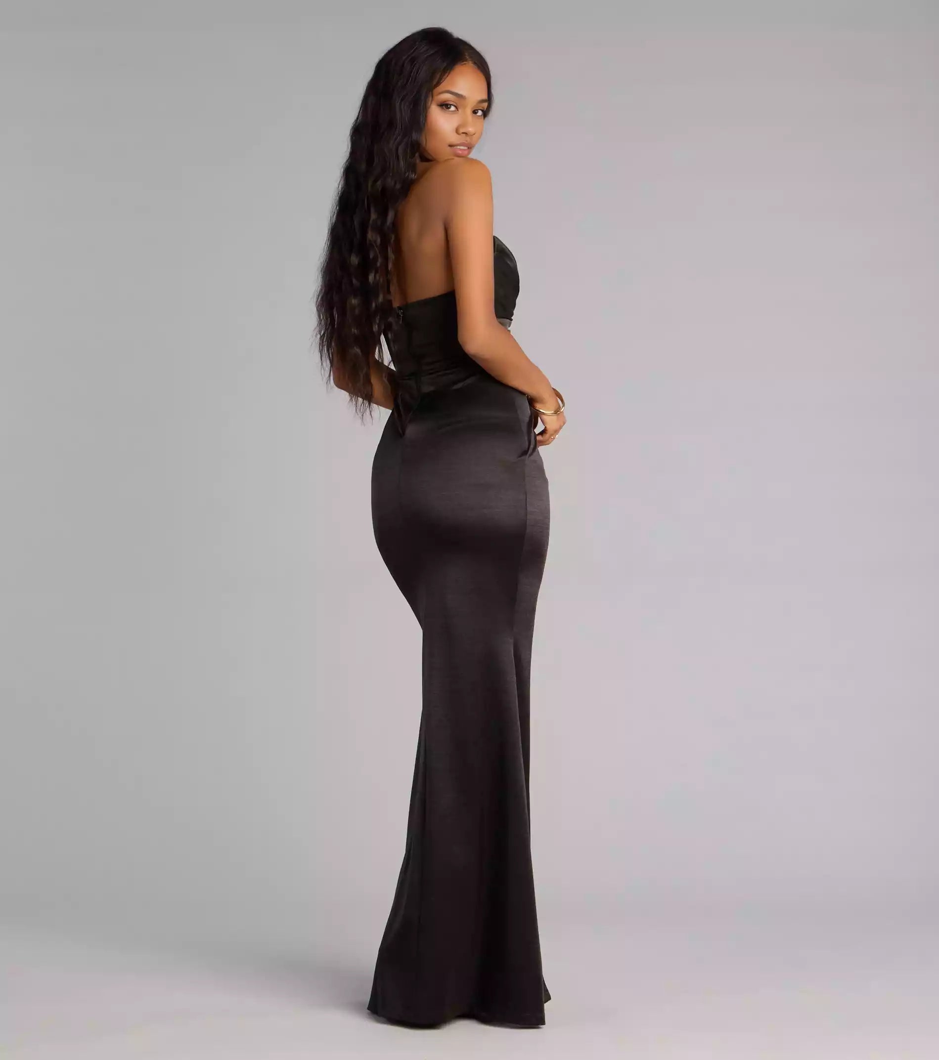 OKBBN's charming elastic satin deep V-neckline with pleated decoration, featuring a high front slit mermaid silhouette and a Prom Dresses skirt. This dress is made of satin fabric and features a strapless deep V-design with a slit and fishtail silhouette, showcasing an elegant and sexy style. The satin material has a high-end texture and a natural luster. The strapless deep V-cut showcases charming shoulder and neck lines, while the slit element enhances the flexibility of the design. The fishtail skirt enhances the elegant and graceful feeling, and the overall design fits the body shape. It is fashionable and atmospheric, suitable for occasions such as socialite banquets and high-end dinners, and is a high-quality choice to showcase unique temperament and fashion taste.