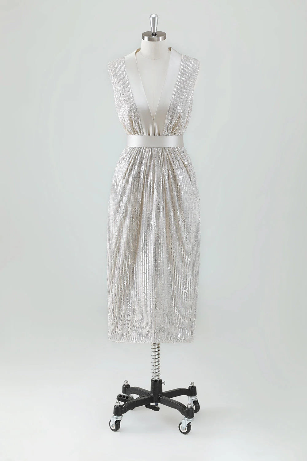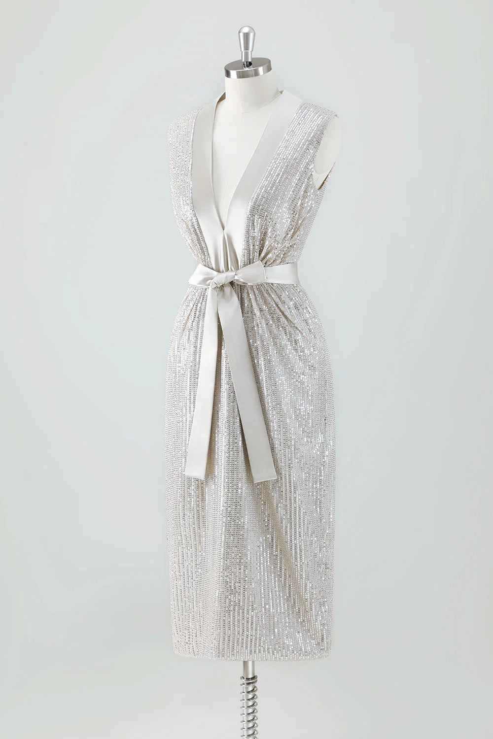 Eye catching shiny tight V-neck knee length sequin bow bridal mother dress