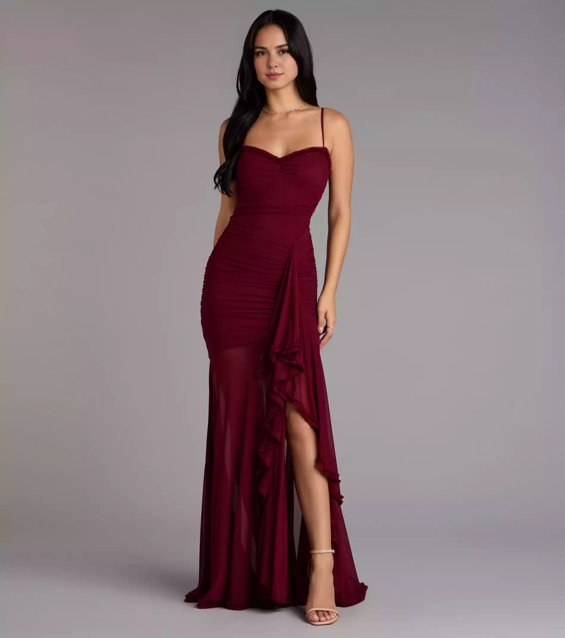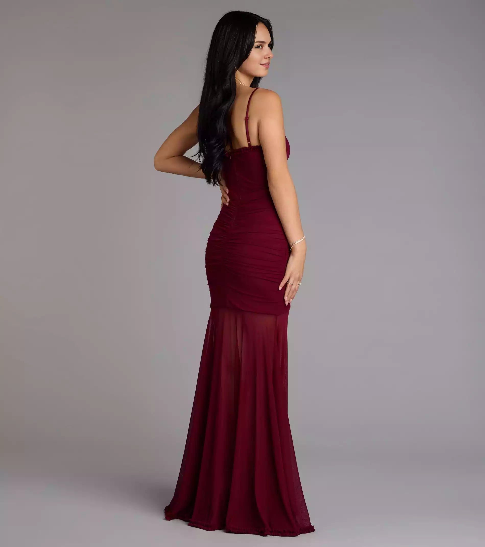 Gorgeous breathable mesh heart-shaped neckline with adjustable thin shoulder straps, high slit front panel, pleated mermaid and floor Prom Dresses