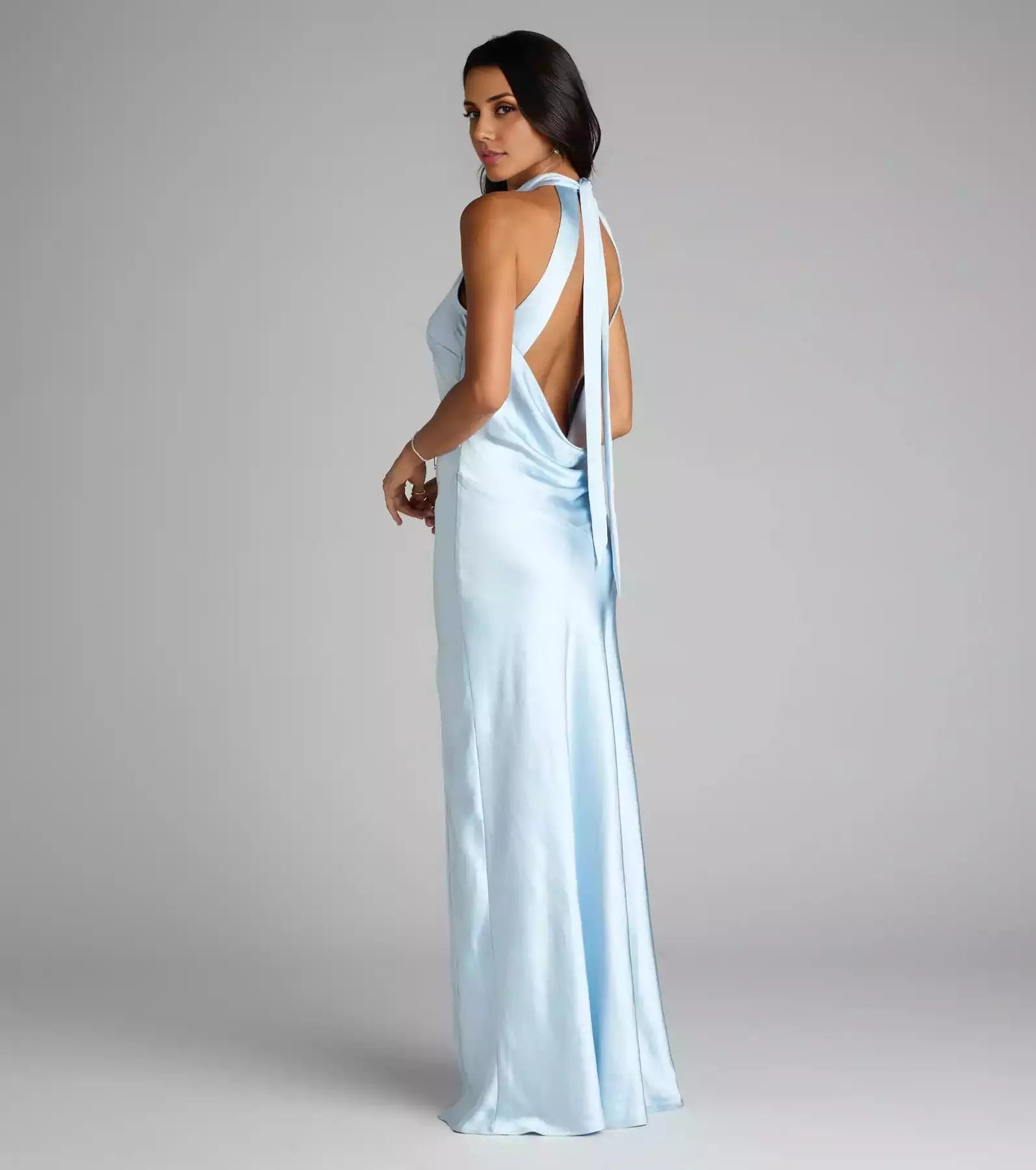 luxurious high-quality satin backless neckline fits snugly with high slit and floor Bridesmaid Dresses. This dress is made of satin fabric, with a hanging neck design paired with a backless and slit cut, showcasing an elegant and light luxury style. The satin material has a smooth and glossy texture, and the neck hanging cut showcases delicate shoulder and neck lines. The exposed back and ribbon design add fashionable details, and the slim fit fits the body shape. The side slit enhances the flexibility of the shape, making it a high-end and atmospheric choice suitable for occasions such as socialite banquets and bridesmaid gifts. It is a high-quality choice to showcase unique temperament and fashion taste.