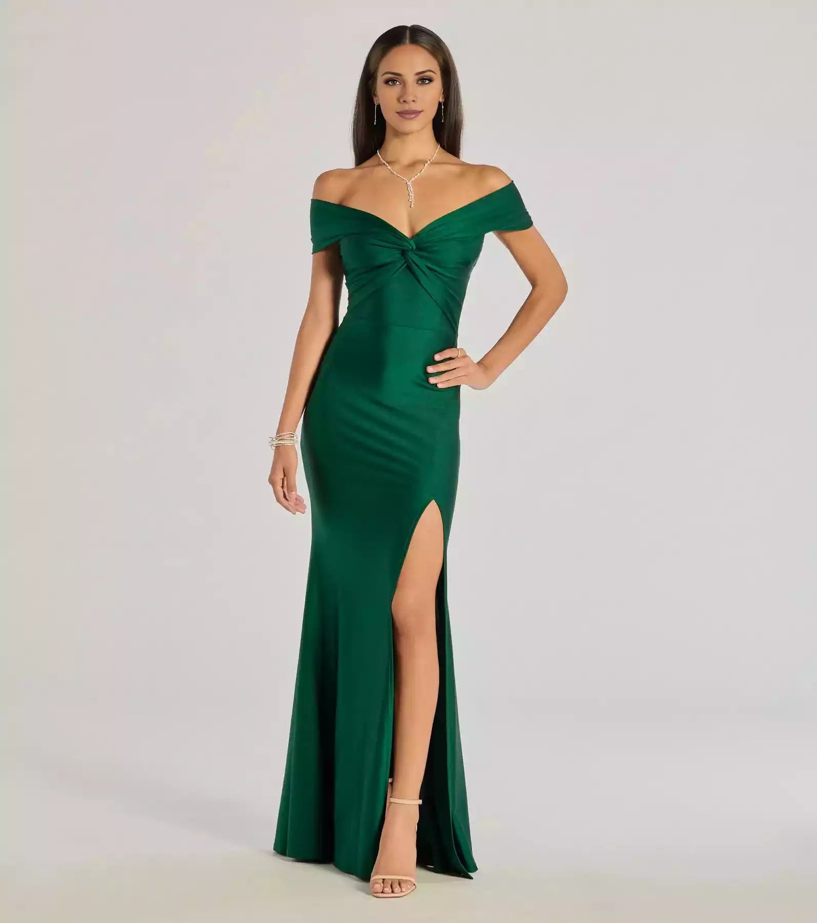 Gorgeous smooth knit off shoulder heart-shaped twisted neckline with high slit mermaid and floor Prom Dresses
