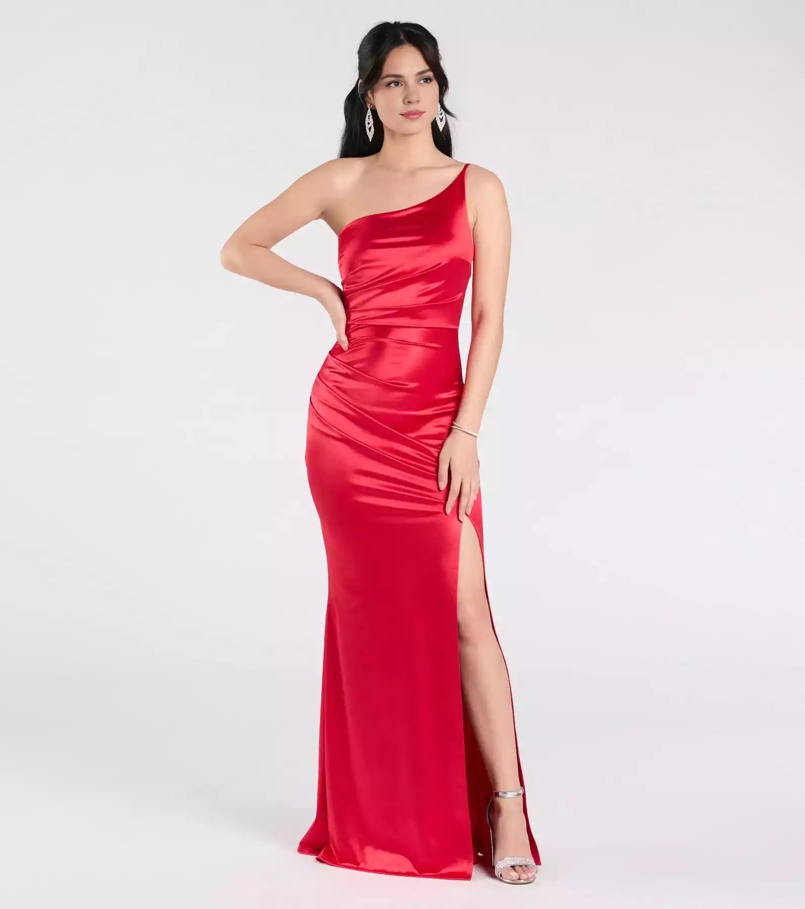 OKBBN's stunning stretch satin lining, single shoulder neckline, back zipper, high front slit, snug fit and Prom Dresses. This dress is made of satin fabric, with slanted shoulders and pleated design paired with a long slit fish tail silhouette, showcasing a bright and elegant style. The satin material has a rich luster, with a slanted shoulder cut that accentuates the shoulder and neck lines, pleat details that optimize body proportions, a single-sided slit that enhances the flexibility of the design, and a fishtail skirt that fits the body and enhances the elegant aura. It is suitable for high light occasions such as dinners and dances, and is a high-quality choice to showcase fashion taste and warm atmosphere.